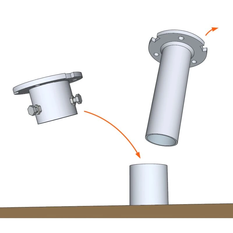 Connecteur « chapeau » qui se fixe avec trois vis M12 sur une vis de fondation bloquée, dont on a coupé la tête. Ce connecteur est également utilisé pour placer des connecteurs sur un tube 60 ayant servi de rehausse sur une vis de fondation.